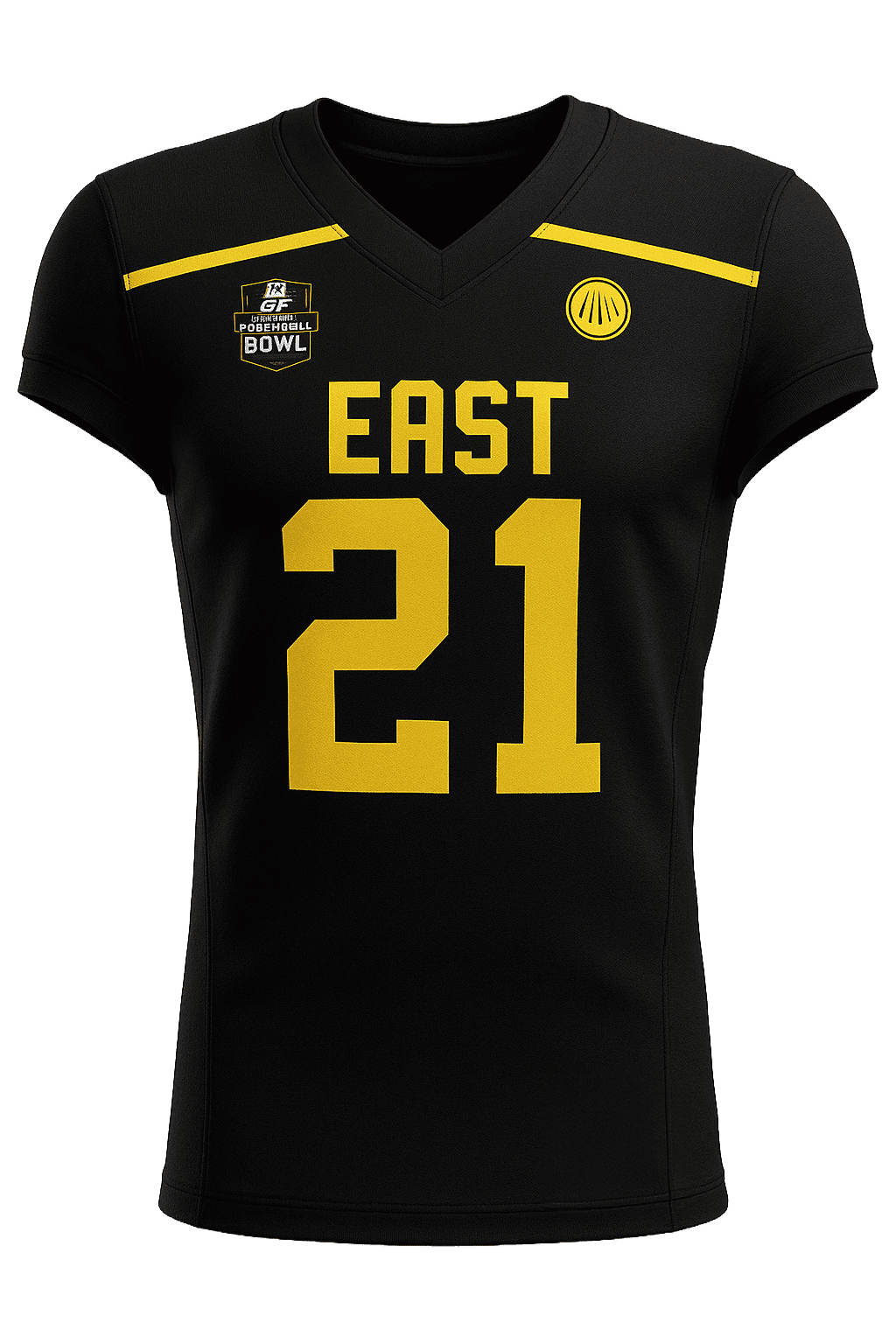 Command attention on and off the field with the All-Star Football Jersey by Ultimate Apparel. Featuring a sleek black design with bold gold accents, embroidered patches, and performance-ready padding, this uniform is built for elite players who play to win.