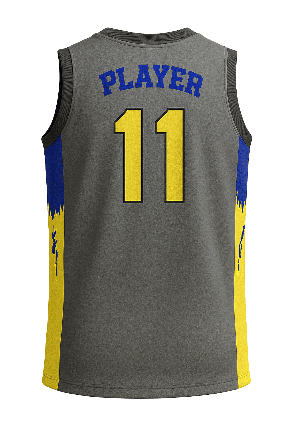 Gray basketball jersey with yellow and blue accents, bold lettering, and side claw graphics