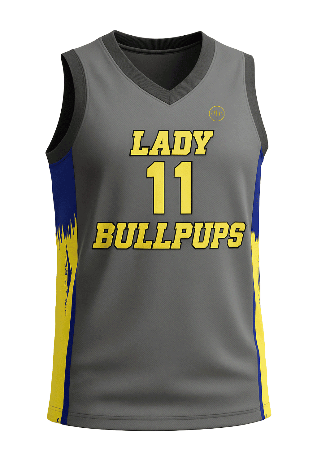 The Lady Bullpups Jersey stands out with its sleek gray base accented by vibrant yellow and blue panels. The chest features bold “LADY” text above the player number and “BULLPUPS” below, both in high-contrast yellow outlined in black for maximum visibility. Side panels incorporate claw-mark inspired graphics in yellow and blue, giving a fierce and dynamic edge. Made from lightweight, moisture-wicking performance fabric, this jersey ensures breathability, durability, and full range of motion for optimal court performance.