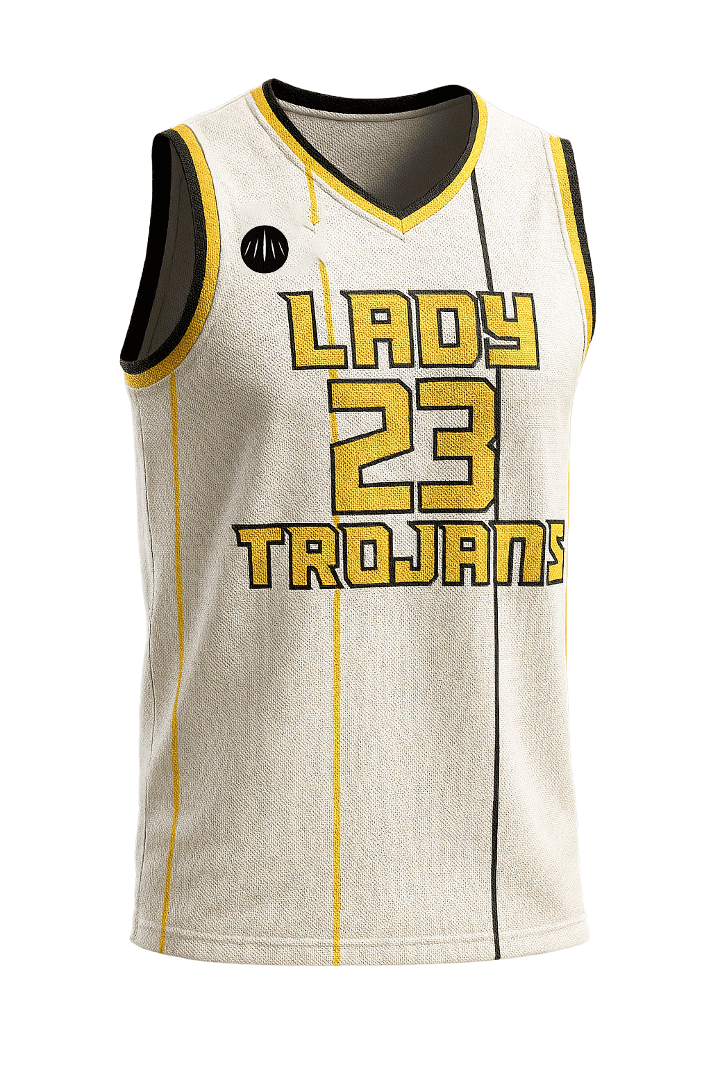 The Lady Trojans Jersey delivers a vintage-inspired look with a cream base accented by vertical gold and black pinstripes. Block varsity lettering and numbers in black with gold trim make for an authoritative style. Engineered for durability, this jersey features reinforced seams, a breathable weave, and a professional-grade fit suitable for intense games or training.