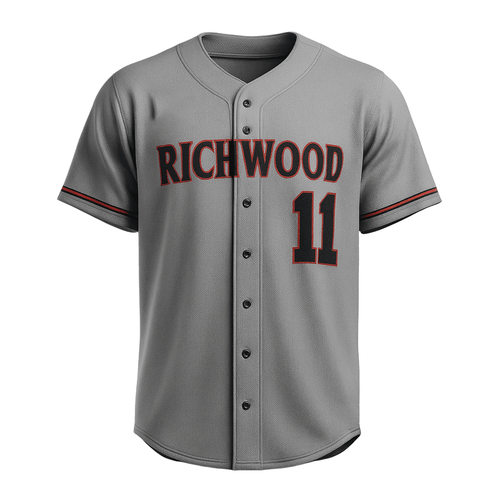 Step up your game in the Richwood Full Button Softball Jersey, a perfect balance of tradition and performance. Crafted from lightweight, moisture-wicking polyester mesh, this jersey keeps you cool and comfortable while maintaining a professional game-day look. The athletic gray body is accented by bold RICHWOOD lettering in black outlined with red, paired with the number 11 for a strong, competitive statement. Subtle black-and-red sleeve striping adds clean detailing, while the reinforced stitching and full-button closure ensure durability and a true baseball silhouette. Designed for players who value comfort and heritage, this jersey performs as well on the field as it looks off it.