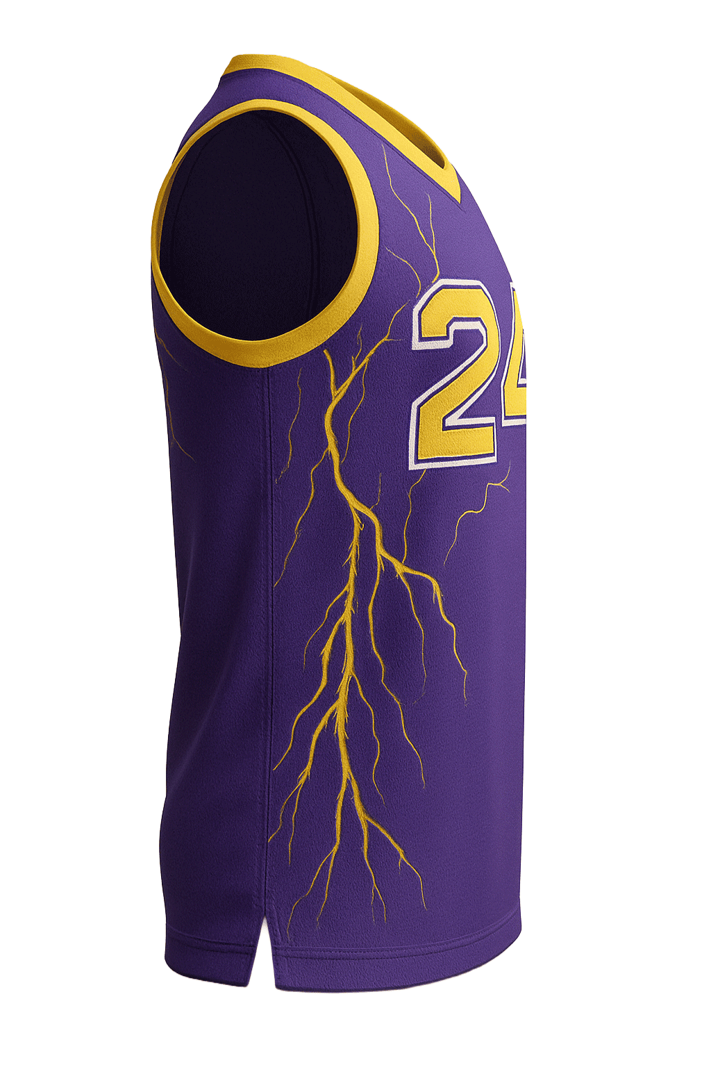 Purple basketball jersey with striking yellow lightning graphics and bold numbering.