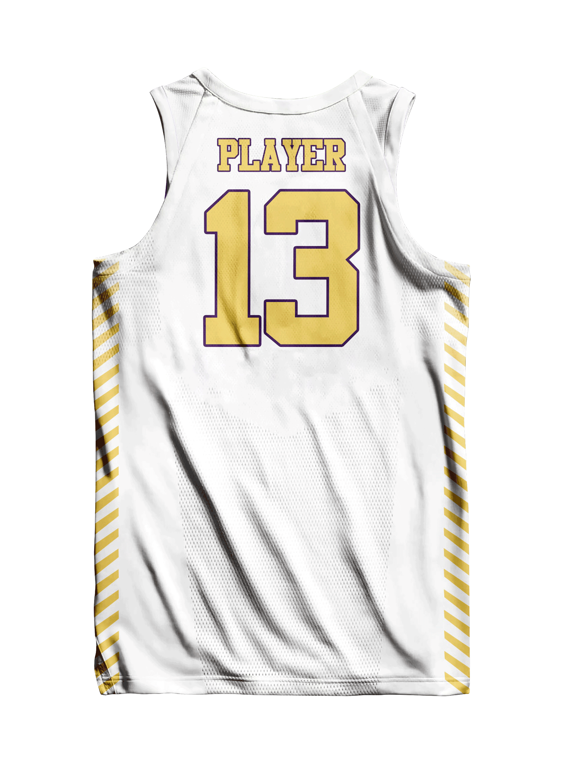 White and gold basketball jersey with diagonal side stripes for an elite, polished look.