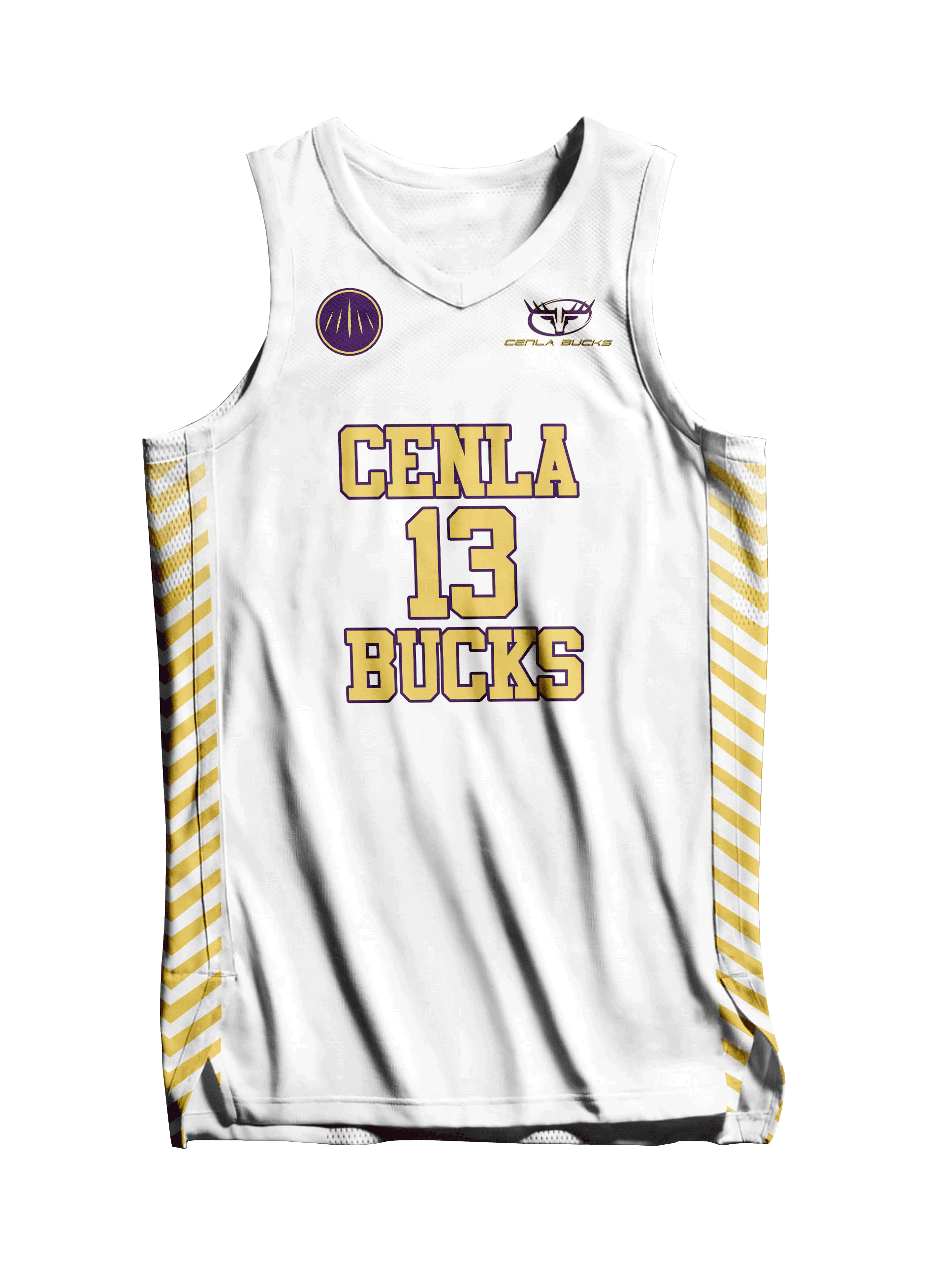 Cenla Bucks basketball jersey, white gold sports uniform, custom basketball apparel, gold stripe jersey, performance basketball top.
